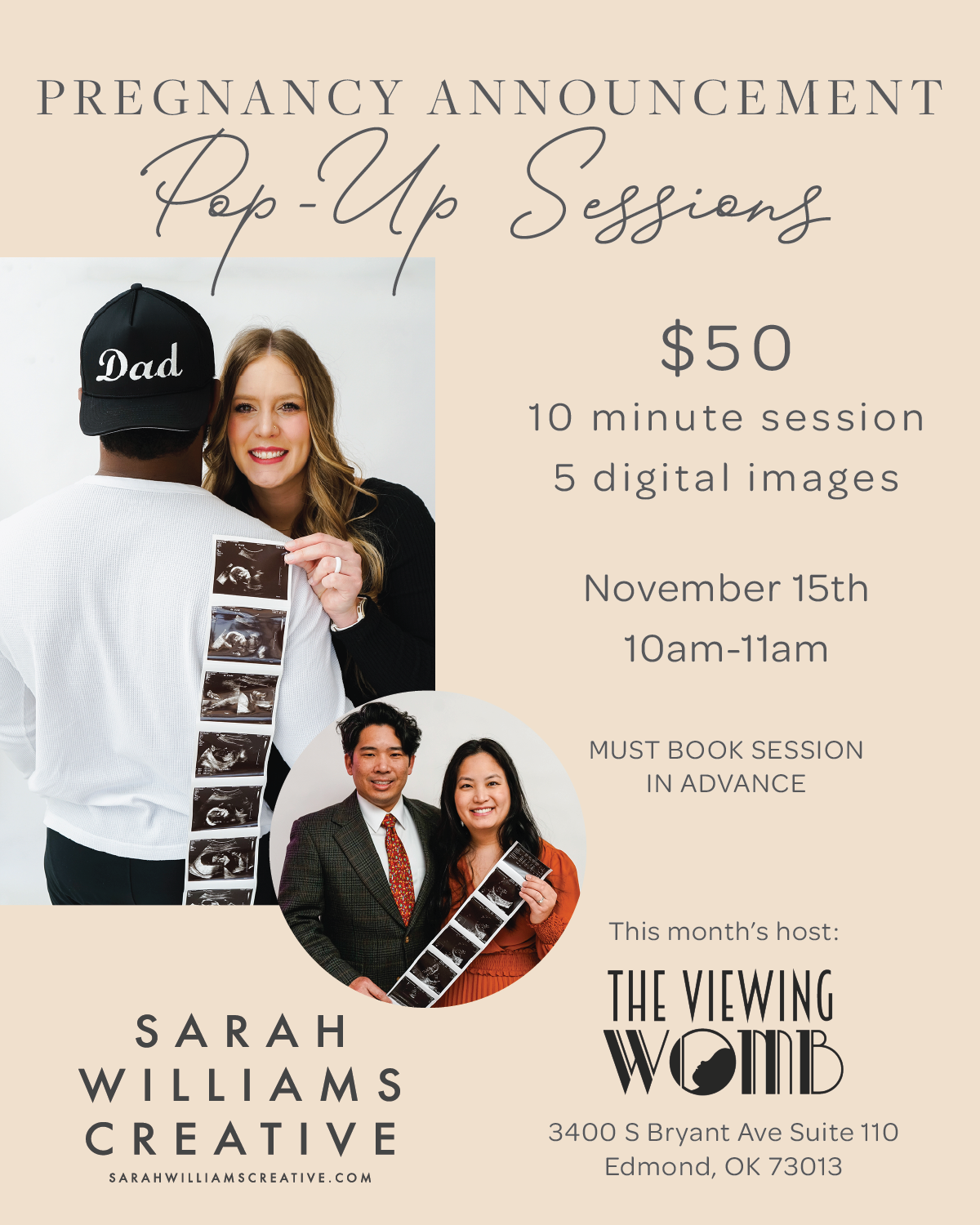 Ready to announce your pregnancy in style? We have a wonderful photographer coming to The Viewing Womb for 10 minute photo sessions so your announcements will be dazzling! This pop-up session comes with 5 digital images and must be booked in advance.